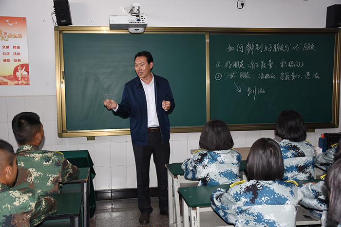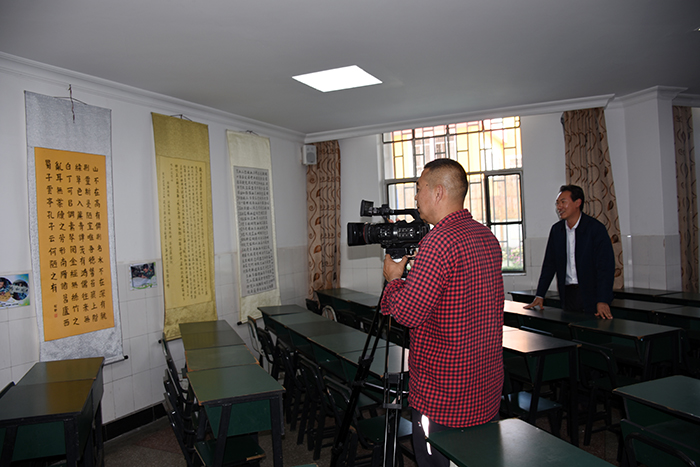 杜記者一行邊走邊看邊拍,從辦公樓到教學(xué)樓、從食堂到宿舍、從操場到教室,全方位、多角度地拍攝,無不被學(xué)校獨具特色的辦學(xué)模式、精細化的教學(xué)管理、精彩紛呈的德育活動、濃厚溫馨的育人氛圍和豐碩的教學(xué)成果所打動。走到心理輔導(dǎo)室門口,看著心理輔導(dǎo)老師在給學(xué)生做“一對一”心理輔導(dǎo),杜記者在不打擾的情況下進行拍攝,并在另一間心理輔導(dǎo)的沙盤面前停留很久。與此同時,魯校長也悄悄走到教室,查看孩子們的學(xué)習(xí)情況。不看還好,一看卻再也忍不住腳步,情不自禁走進去和孩子們親切交談,語重心長地聊起了“如何辨別好朋友與壞朋友”,孩子們紛紛爭相發(fā)言,表明觀點,大聲說出好朋友就是積極的、可愛的、身心健康的、能共同成長的、有正能量的等觀點,看著孩子的成長,魯校長甚是欣慰,或許這就是刻在骨子里的教育情節(jié)。這一畫面,也被杜記者默默記錄。