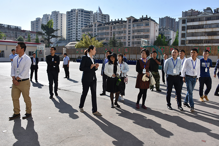 風和日麗春意濃,花開蝶舞景致新。2019年4月20日上午,四川師范大學附中安寧校區(qū)20余名校領導、老師在王佳瑞校長的率領下,專程到我?疾旖涣。本次交流活動由參觀校園、觀摩學生匯報表演兩部分組成。