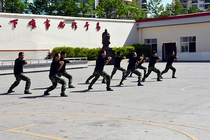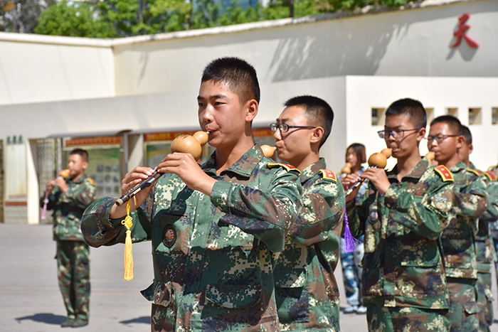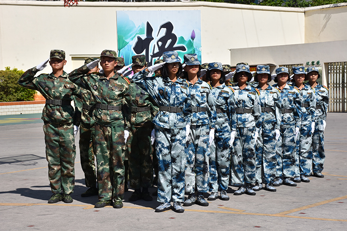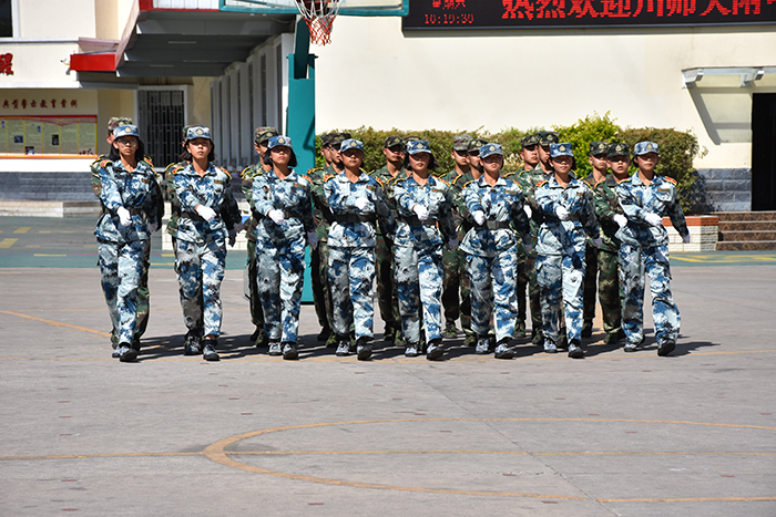 參觀結束,全體人員在操場集合。國旗手英姿颯爽、精神抖擻地入場,進行了莊嚴的升國旗儀式,師生們軍容嚴整,行著標準的軍禮注視著五星紅旗冉冉升起。隨后,軍事匯報表演在迎校旗中拉開序幕。
