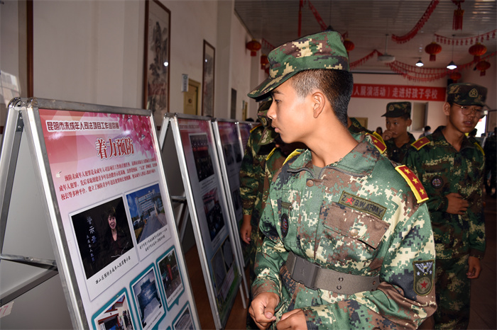 與此同時,昆明市關工委未成年人司法項目工作安寧巡展在多功能室也開展得如火如荼,學校師生跟隨領導們的腳步,在工作展板前認真聽取講解并仔細觀看。巡回展不僅展出了近幾年云南各地區(qū)未成年人司法項目實施的情況和取得的成效,還選取了典型案例以案釋法,直觀地展示了觸法犯罪的代價,有效地引導幫助學生從小樹立“學法、守法”的意識,強化法制觀念。