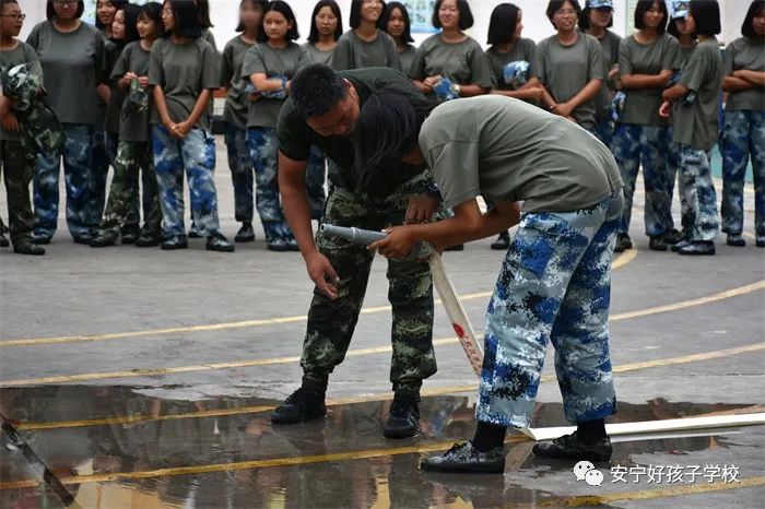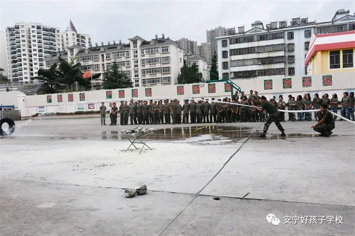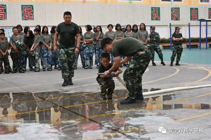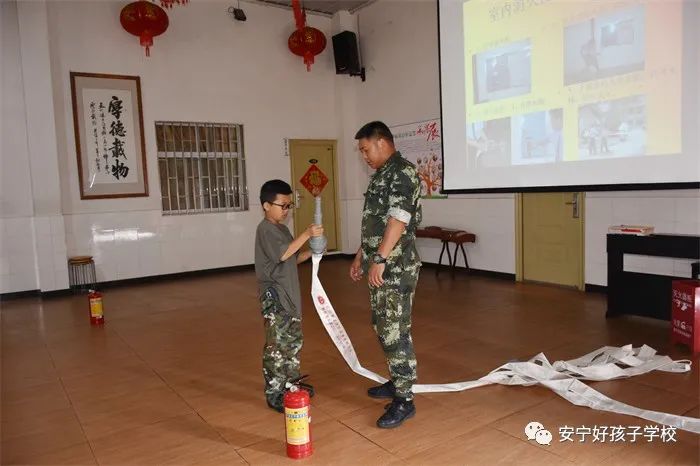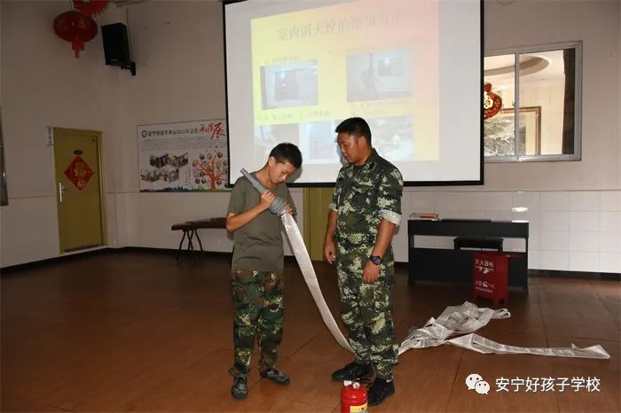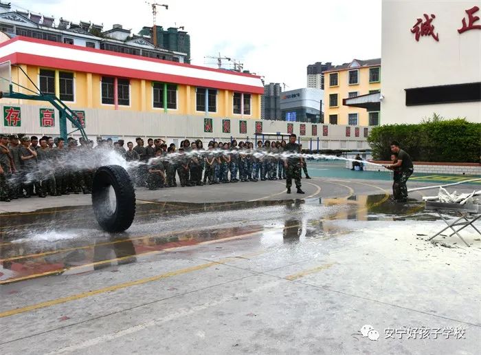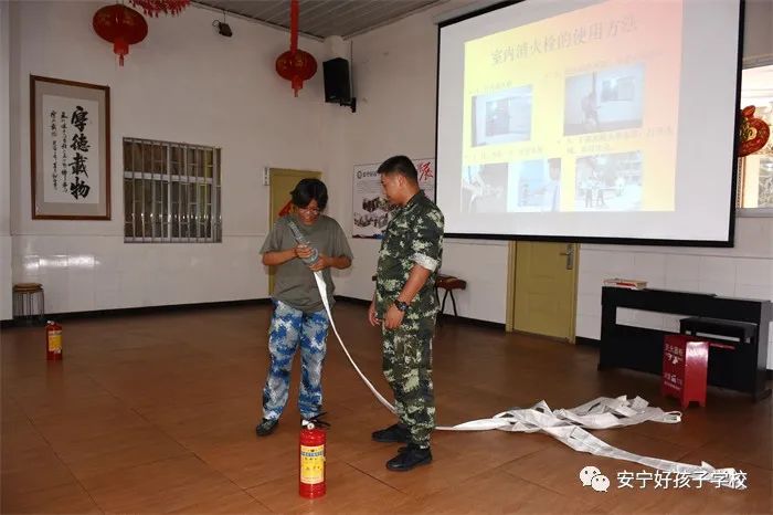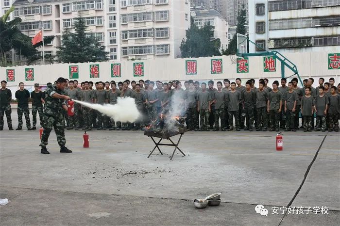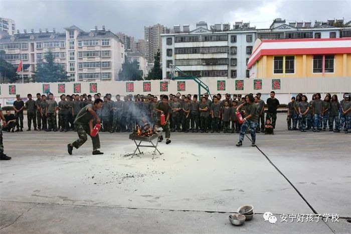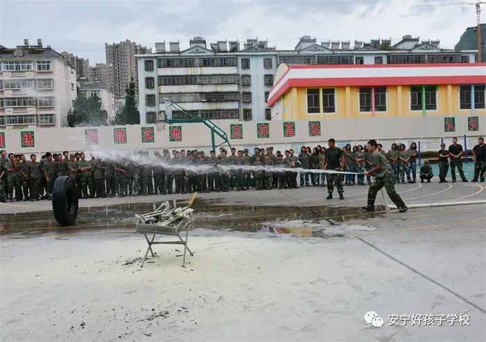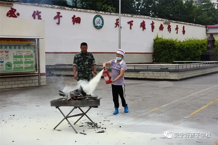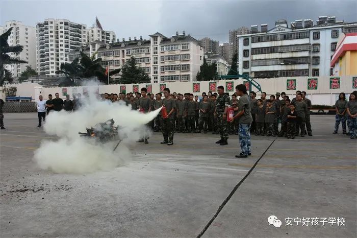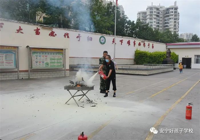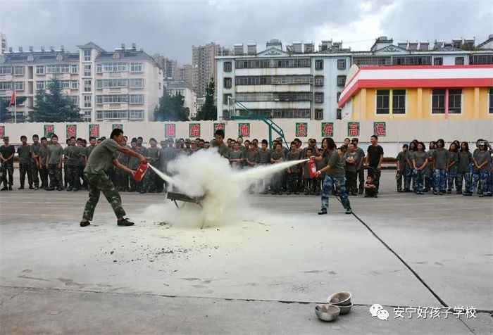 最后,進(jìn)行了撲救演練。操場(chǎng)上的木材點(diǎn)燃后,火苗迅速變成了熊熊大火,老師開始現(xiàn)場(chǎng)演示滅火設(shè)備(滅火器、高壓水槍)的使用方法,并指導(dǎo)全部學(xué)生親自操作演練。