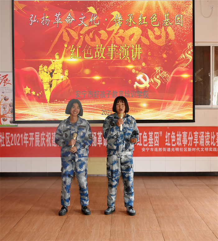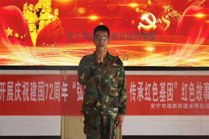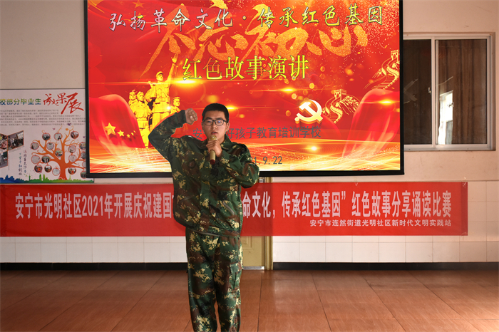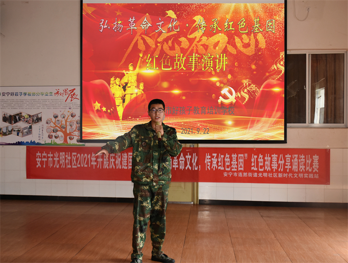 為慶祝建國(guó)72周年,深入推進(jìn)社會(huì)主義核心價(jià)值觀體系建設(shè),引導(dǎo)師生進(jìn)一步堅(jiān)定理想信念,繼承和發(fā)揚(yáng)革命先烈的優(yōu)良傳統(tǒng),2021年9月22日,我校與安寧市光明社區(qū)聯(lián)合開展了以“弘揚(yáng)革命文化·傳承紅色基因”為主題的紅色故事誦讀比賽活動(dòng)。