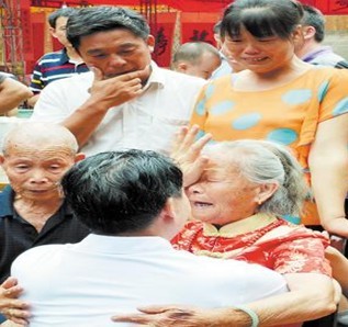 《北大校長(zhǎng)周其鳳回瀏陽(yáng)慶祝母親90大壽 長(zhǎng)跪在母親膝前》的一組照片最先在瀏陽(yáng)論壇上出現(xiàn)。組圖中,周其鳳跪在母親跟前,雙眼緊閉,緊抱著母親,母子兩人抱頭流淚,他看到母親老淚縱橫,輕輕為母親擦拭淚水。現(xiàn)場(chǎng)圍觀的群眾被這幅畫面所感動(dòng),有的鼓掌,有的跟著默默流淚。